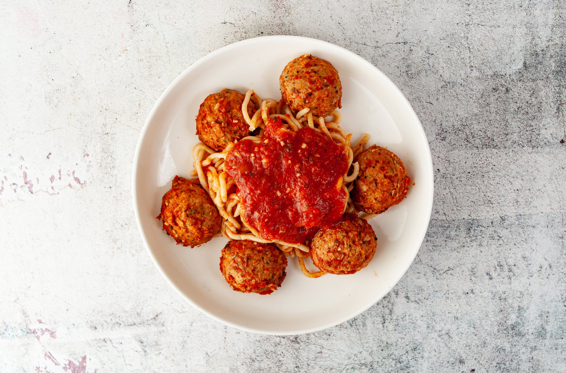 Meatballs made of a mixture of roasted red peppers and seasonings based with ground chicken, served with brown rice pasta tossed in our homemade tomato sauce.